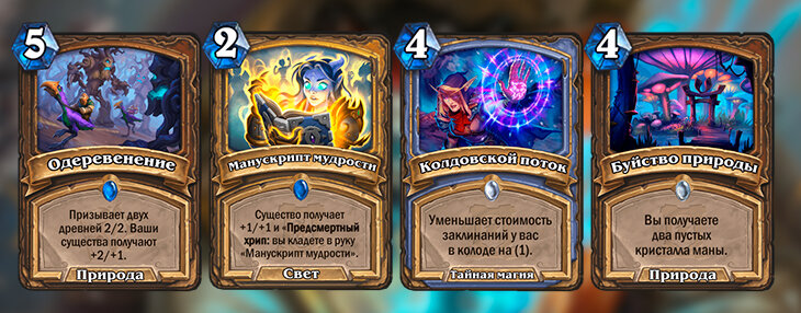 - «Одеревенение» подняло в топы агроколоды Друидов. Много матчей заканчивались на пятом ходу, если у Друида если было что-то на столе – два существа и массовый бафф остальных непросто зачистить, если ты не придумаешь, где взять много дешевых заклинаний.