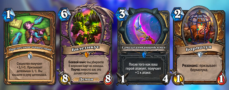 - Один Билетикус – хорошо, а два или три – еще лучше! Жрецы и Чернокнижники получили универсальную карту, которая могла вытащить им любой матч с контроль-колодами. 3 урона за возможность дважды или трижды поставить на стол одно и то же существо – слишком низкая цена.