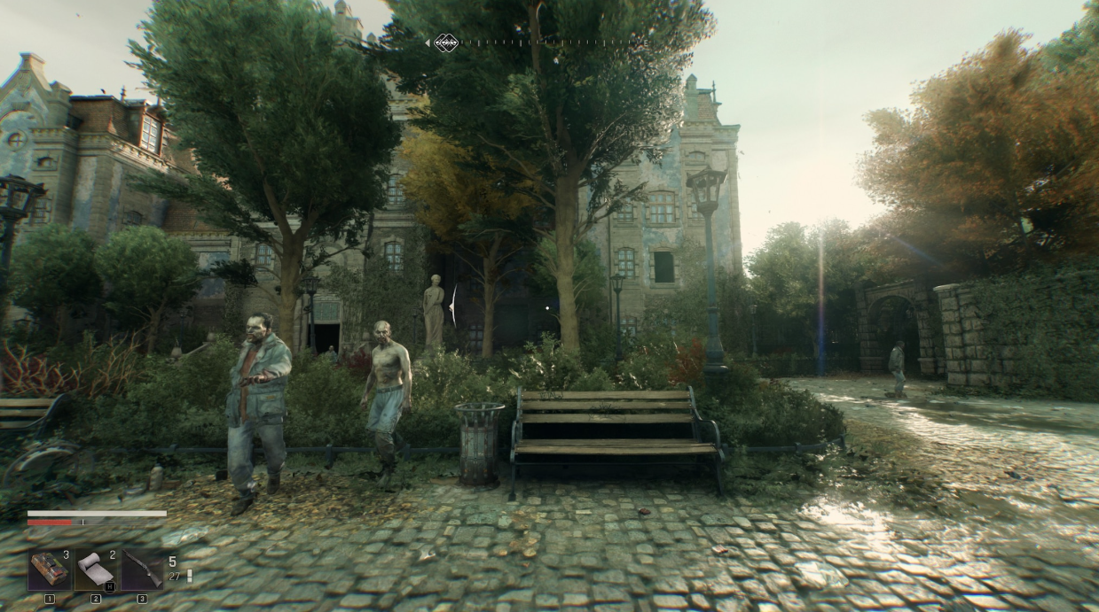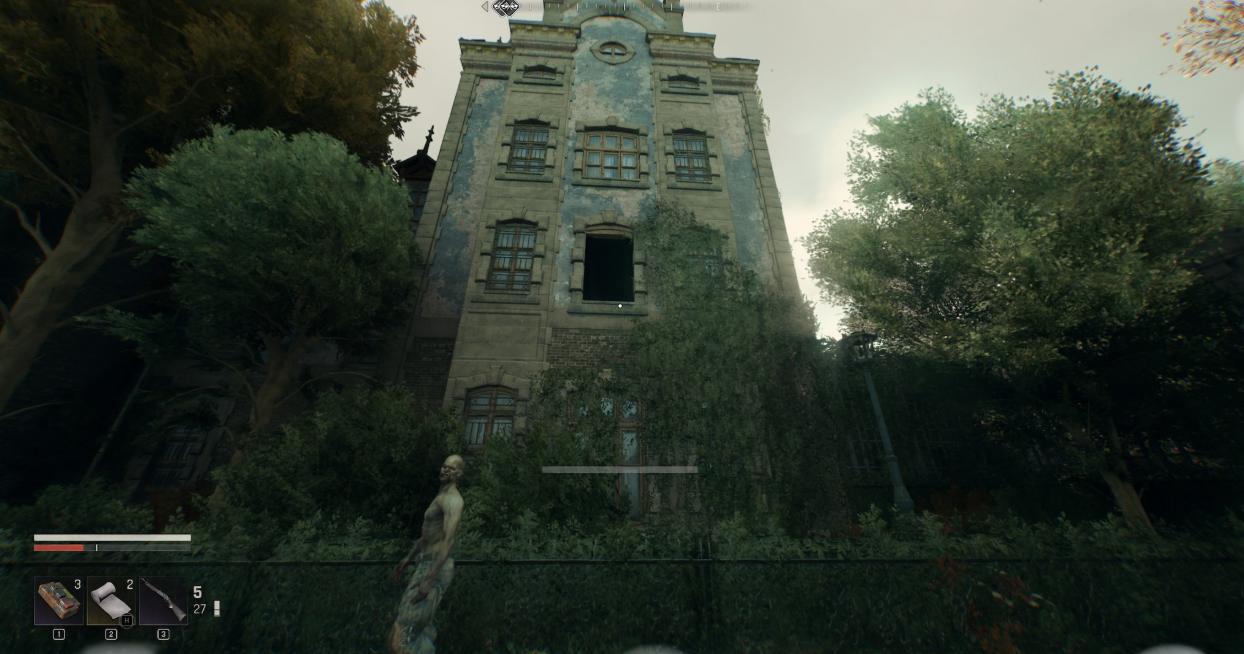 Перед главным входом обычно находится несколько заражённых. Лучше зачистить площадку заранее или воспользоваться оружием дальнего боя, чтобы не мешали подъему. - Осмотреть левую часть фасада.