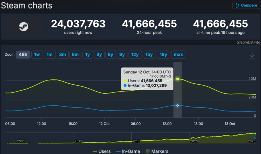 Игровая платформа Steam установила новый исторический максимум посещаемости, зафиксировав более 41,6 миллионов одновременных пользователей. Данный показатель превышает предыдущие рекорды сервиса и демонстрирует продолжающийся рост популярности ПК-гейминга.