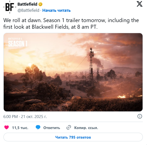 Electronic Arts объявила дату выхода трейлера для первого сезона Battlefield 6. Видеоролик появится сегодня, 22 октября, в 18:00 по московскому времени. Трейлер продемонстрирует новую карту Blackwell Fields, которая станет одним из ключевых дополнений грядущего обновления.