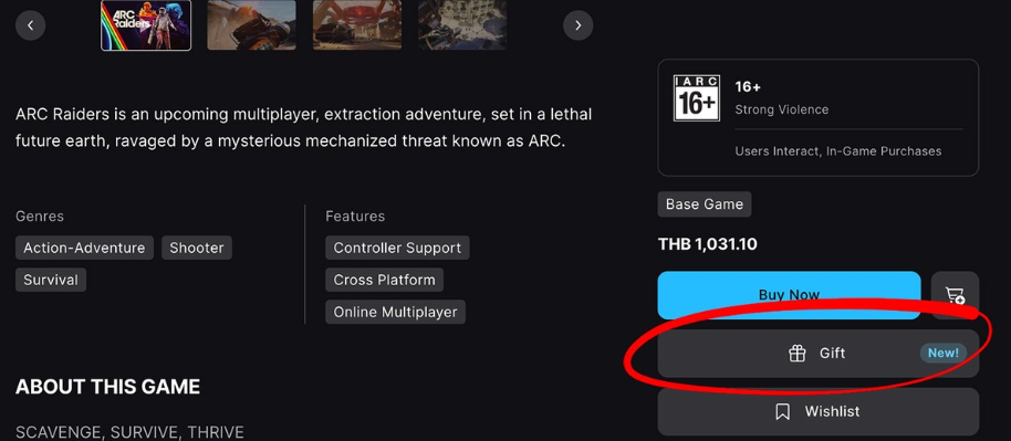 На странице игры в магазине теперь появилась кнопка Gift под стандартной кнопкой покупки. При нажатии система попросит войти в аккаунт Epic Games, затем ввести данные аккаунта получателя, выбрать одно из готовых сообщений и указать дату, когда подарок должен “прийти” к адресату.