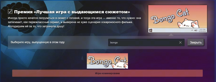 К счастью, система позволяет самостоятельно вписать практически любую игру в каждую категорию – главное, чтобы она вышла в 2025 году, за исключением категории “Любимое дитя” для постоянно обновляемых проектов. Это означает, что технически можно номинировать Bongo Cat на премию за выдающийся сюжет, что автор новости с гордостью и провернул. А что вы мне сделаете?
