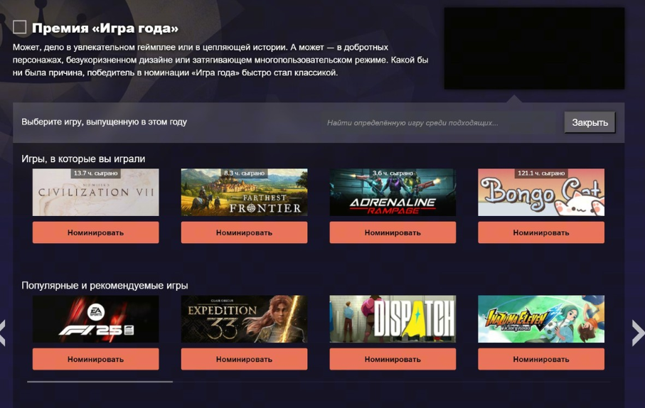 Система номинирования в этом году предлагает персонализированные рекомендации игр, в которые пользователь играл в 2025 году, а также список популярных тайтлов для тех, кто предпочитает голосовать за потенциальных победителей. Однако алгоритм подбора кандидатов работает странно – некоторые категории показывают неожиданные результаты, а другие и вовсе утверждают, что игрок не пробовал подходящие игры за весь год. Например, в игре года первой Valve предлагает выбрать F1 2025. Извини, Гейб Ньюэлл, но кажется год был слегка лучше.