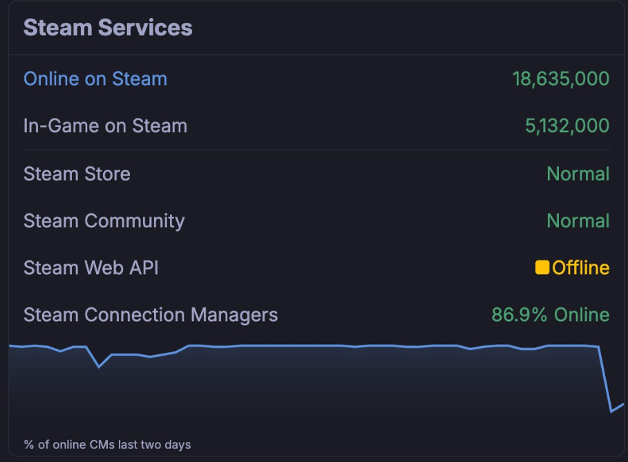 Особенно серьезная ситуация сложилась с серверами подключения – только 47,5% менеджеров соединений оставались онлайн, что показывает резкое падение на графике за последние два дня. API для популярных игр также вышли из строя – Counter-Strike, Deadlock, Dota 2 и Team Fortress 2 показывают статус Service Unavailable.