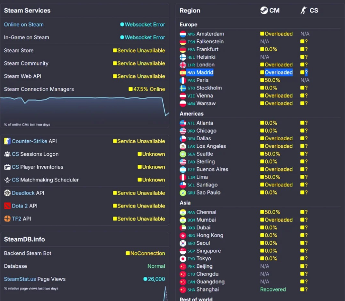 Согласно данным мониторинга SteamDB.info, сразу несколько ключевых сервисов платформы перестали работать. Онлайн-подключение и внутриигровое подключение к Steam показывают статус Websocket Error, в то время как Steam Store, Steam Community и Steam Web API были полностью недоступны с пометкой Service Unavailable.