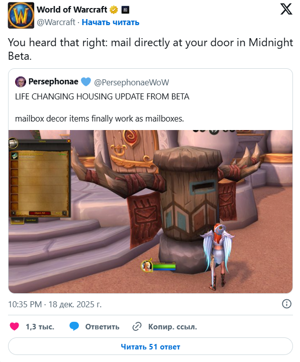 Контентмейкер Persephonae обнаружила в последней сборке беты World of Warcraft: Midnight, что почтовые ящики перестали быть просто декоративными элементами и начали функционировать как настоящие. Официальный Twitter-аккаунт подтвердил, что это намеренное изменение, которое появится в Midnight. Любой почтовый ящик, существующий в игре сейчас или добавленный позже, позволит персонажам отправлять и получать сообщения точно так же, как в городах.