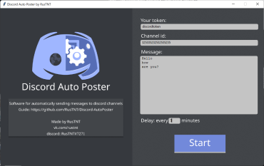 После запуска программы вы увидите интерфейс в который нужно вставить ваш токен дискорда, ид канала, сообщение и задержку в минутах