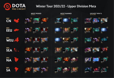 Самое больше разнообразие персонажей было в статистике по проценту побед. В Европе чаще всего выигрывал Outworld Destroyer, а в СНГ — Beastmaster. В Северной Америке по этому показателю лучшей стала Luna, а в Китае — Broodmother.