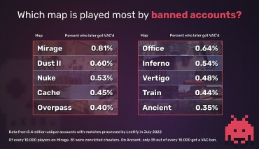 Аналитический сервис Leetify провёл исследование с целью выяснить, какие карты чаще всего выбирали читеры до получения VAC-бана. Оказалось, что больше всего матчей нечестные игроки проводили на Mirage — на каждых 10 тыс. пользователей приходится 81 нарушитель (0,81%).