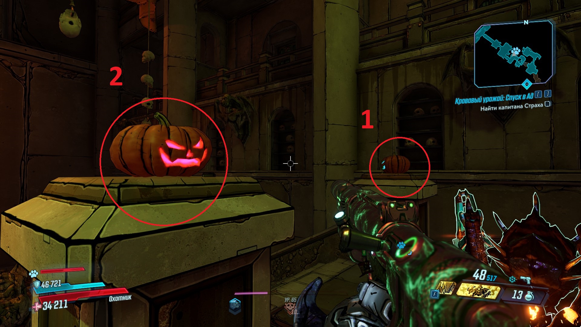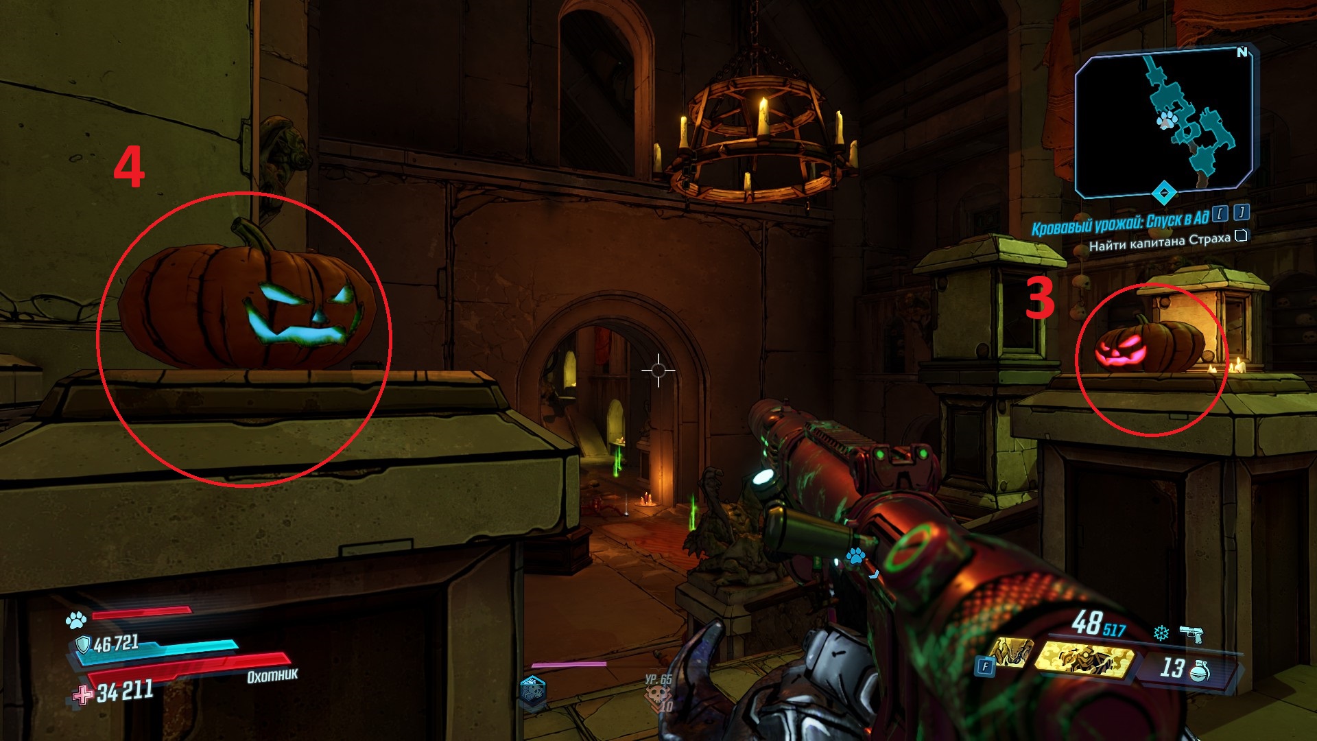 Убиваем внутри несколько рэчей и видим перед нами две лестницы с 4 тыквами, и далее, в соседнем комнате 4 разноцветных черепа. Это и есть загадка.