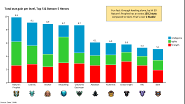 Пользователь Reddit с ником Shurukan составил диаграмму, в которой отобразил героев с самым высоким и самым низким приростом атрибутов (сила, ловкость, интеллект – в сумме) за уровень.