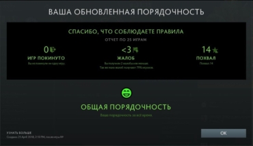 А, кстати. Ответим на вопрос, который так интересует всех. Когда же обновляется порядочность в Dota 2? А тут все просто. Она обновляется каждую вашу игру. Каждый лайк, каждый репорт, заработанный вами – скажется на порядочности в игре. Ну а каждую 10 игру вы будете видеть табличку с вашими данными.