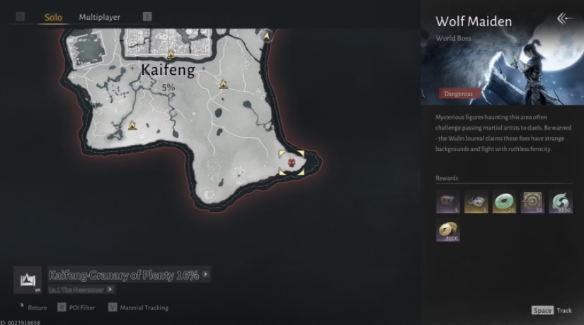 Логово Волчьей Девы расположено в самом юго-восточном углу карты Кайфэна, восточнее пограничного камня «Хребет Отчаяния» (Desperation Ridge). Обязательное условие: босс появляется только в ночное время (час Сюй). Сражение происходит в отдельном сценарном пространстве; покинуть его можно, нажав на иконку двери в верхней части экрана.