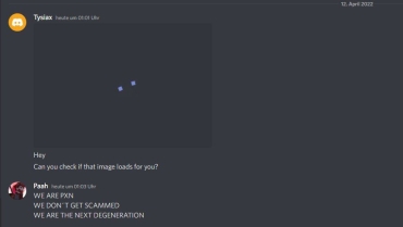 Поступила информация про новый вид взлома аккаунтов в дискорде. Вам скидывают фото, которое якобы не грузится и просят нажать на него, чтобы якобы посмотреть. Не в коем случае не делайте этого, иначе передадите свой дискорд токен в руки взломщика.