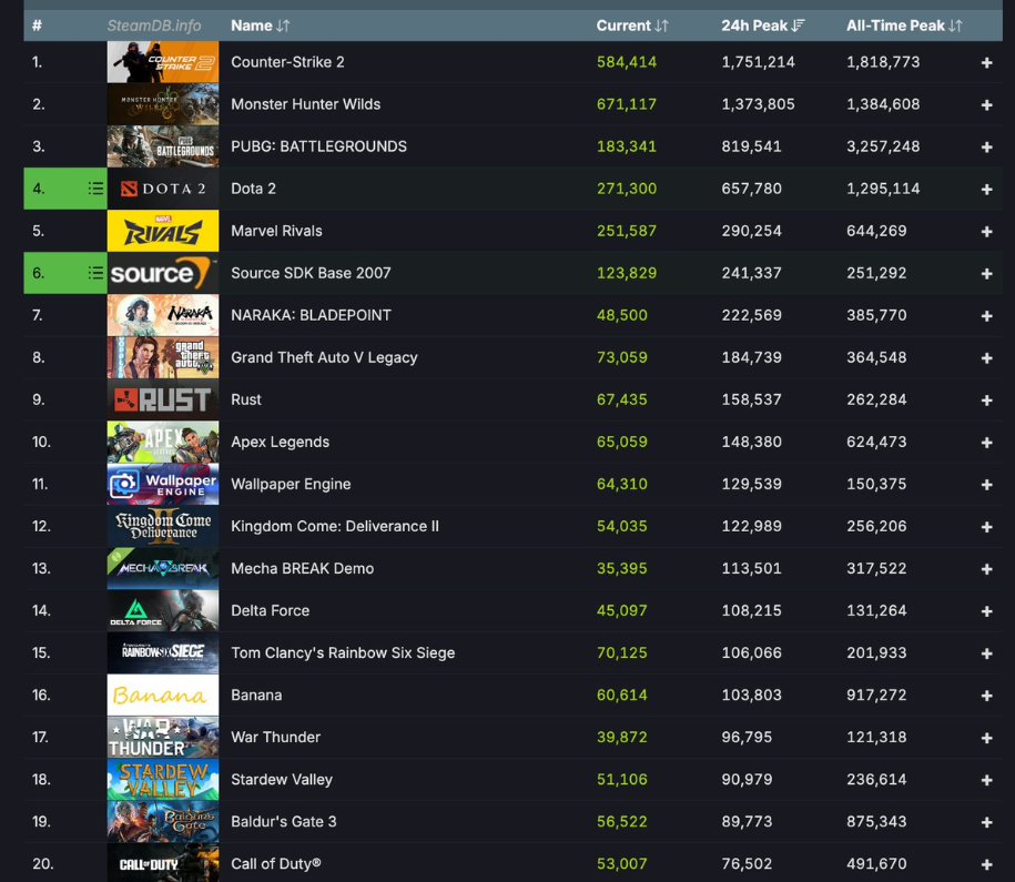 Самой играемой игрой на данный момент остается Counter-Strike 2, за ней следует Monster Hunter Wilds — игра Capcom достигла пика в 1,38 миллиона одновременных игроков.
