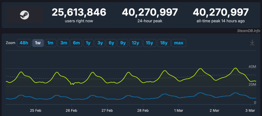 Предыдущий рекорд Steam в 39 миллионов одновременных пользователей был установлен в декабре 2024 года. Таким образом, на его преодоление понадобилось всего около двух месяцев.