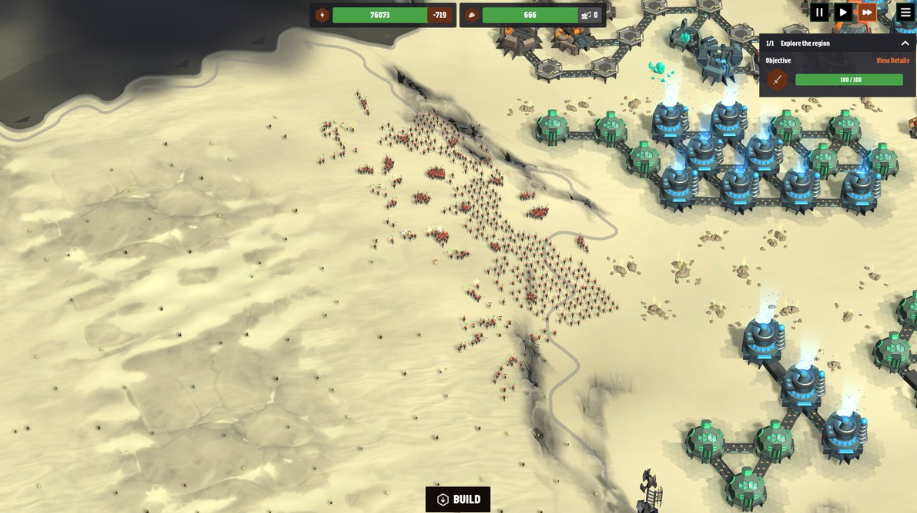 После запуска линий игрок отправляет машины в реальные бои, управляя тысячами юнитов – разведчиков, тяжёлых шагоходов, артиллерийских ботов. Боевая система работает как RTS с ключевым отличием – юниты производятся, а не покупаются. Армия прибывает прямо со сборочной линии. Остановка производства означает отсутствие подкреплений.