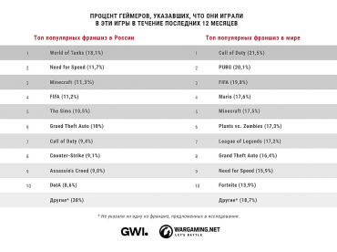 World of Tanks назвали 18,1% пользователей. За ней следуют Need for Speed (11,7%) и Minecraft (11,3%). Популярные киберспортивные дисциплины CS:GO и Dota 2 оказались на восьмом и десятом местах соответственно.